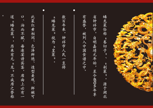嚴選優(yōu)質原料,歷史名菜,傳遞正宗鐘祥蟠龍菜!